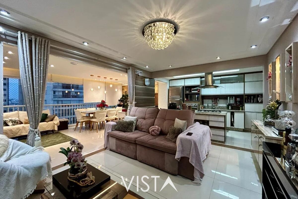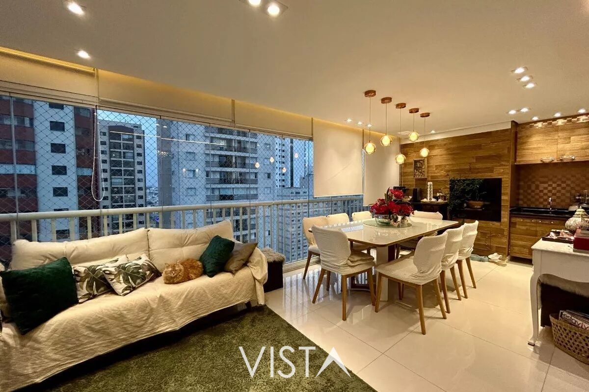 Apartamento no Tatuapé com 137 m², 3 suítes, 2 vagas e terraço gourmet com churrasqueira integrado ao living.