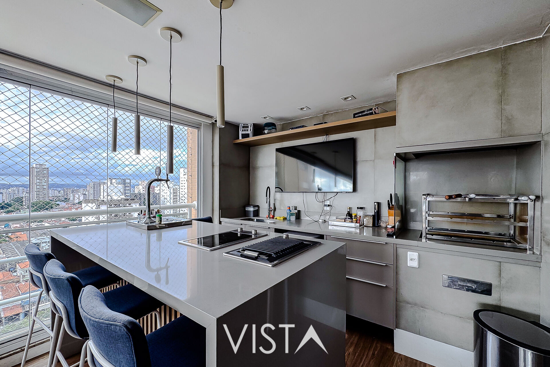 Área Gourmet (Balcão com chopeira profissional, fogão embutido, churrasqueira elétrica no balcão para grelhados, churrasqueira principal na área gourmet a carvão, persianas automatizadas